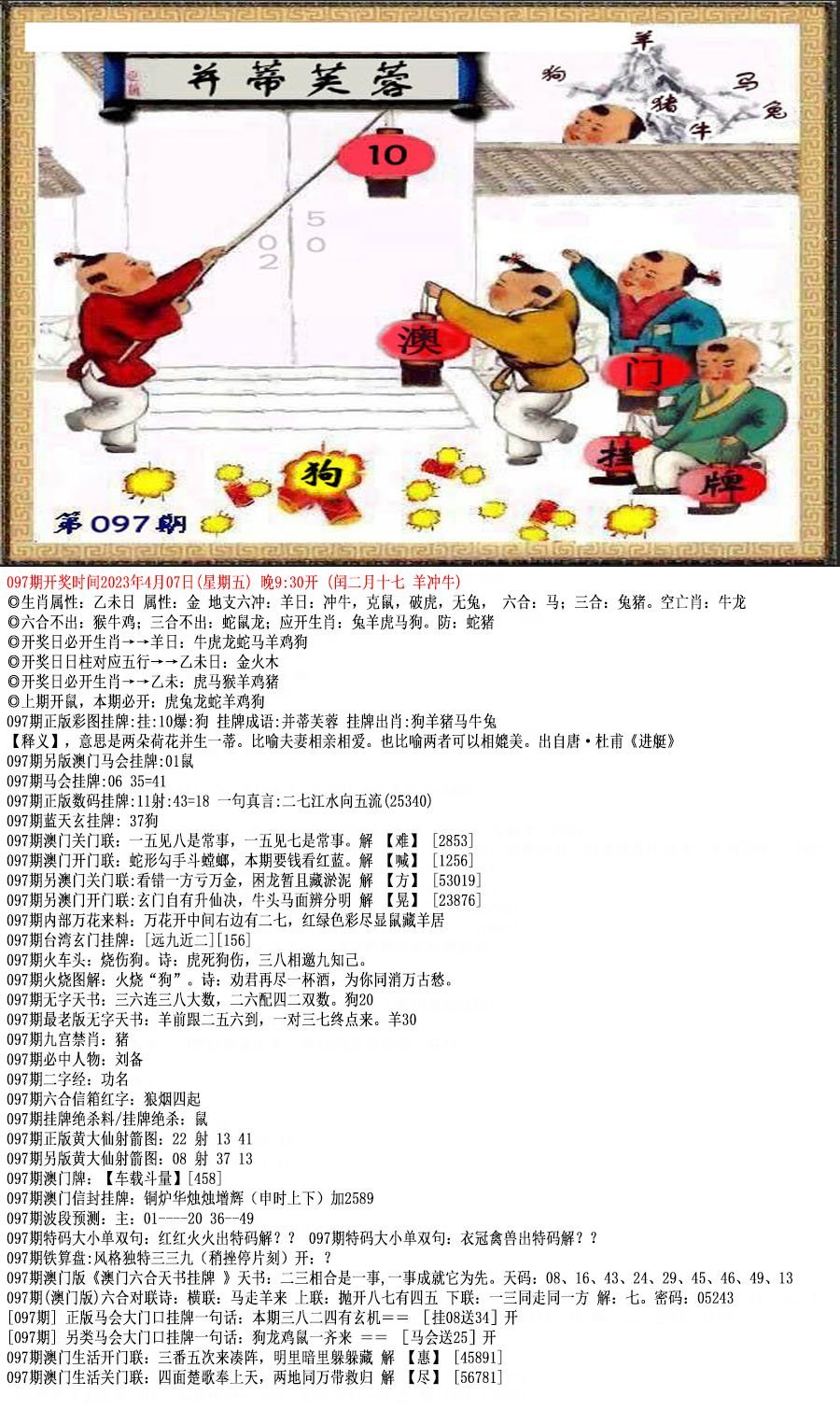 097期开奖时间2023年4月07日(星期五) 晚9:30开 (闰二月十七 羊冲牛)