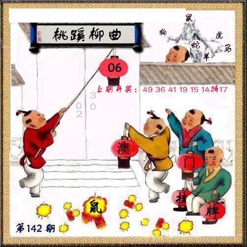 142期挂牌《桃蹊柳曲》 解释:意思是指春景艳丽的地方。出自《迎春乐》。 解料:吉美肖兔龙蛇马羊鸡。挂:06狗,狗冲龙。爆:鼠,鼠冲马。 七肖:龙马狗鼠兔蛇羊 五肖:龙马狗鼠兔 四肖:龙马狗鼠 三肖:龙马狗 二肖:龙马 一肖:龙 |